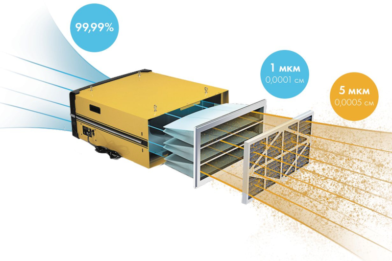 Монтаж установки очистки воздуха не требует дополнительного пространства в мастерской, так как обычно производится под потолком на подвесе, при этом значительно улучшает условия труда и охраны здоровья.