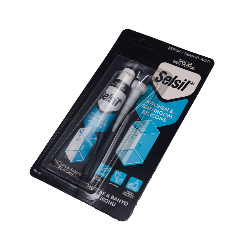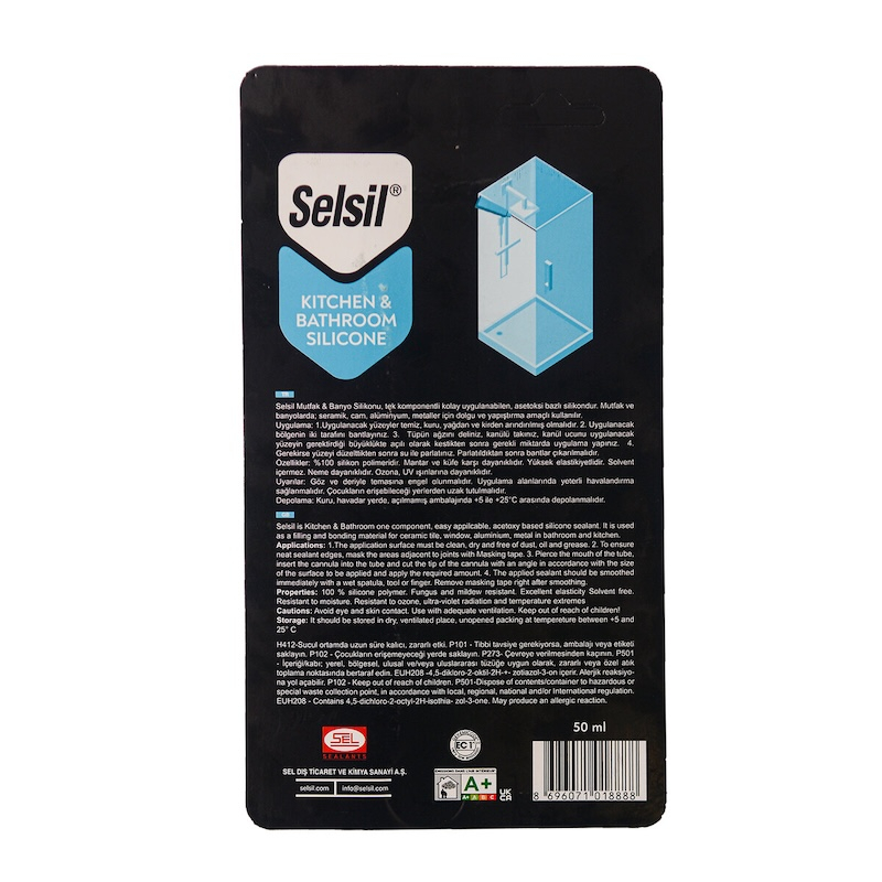 Selsil Kitchen & Bathroom Silicone — це однокомпонентний силікон на основі ацетокси, який затверджує вологою. 100% силіконовий полімер. Стійкий до грибків і плісняви. Висока еластичність. Не містить розчинників. Відповідає ISO 11600 – F&G – 25 LM. Вологостійкий. Стійкий до ультрафіолетових променів. База Силіконовий полімер Система полімеризації Оцтова Щільність 1,02 +- 0,03 г/мл (TS 781-ISO 758) Твердість 16-17 Шор А (через 28 днів) Безлипкий час 12 хв (23 oC, відн. вологість 50%) Швидкість лікування Мін. 2 мм/24 год Подовження при розриві ≥300% (ASTM D412) Втрата обсягу <10% (ISO 10563) Пружне відновлення Яклашик 100% В’ялість 0 мм (ISO 7390) Термостійкість від 45 oC до 150 oC Температура застосування 5-40 oC