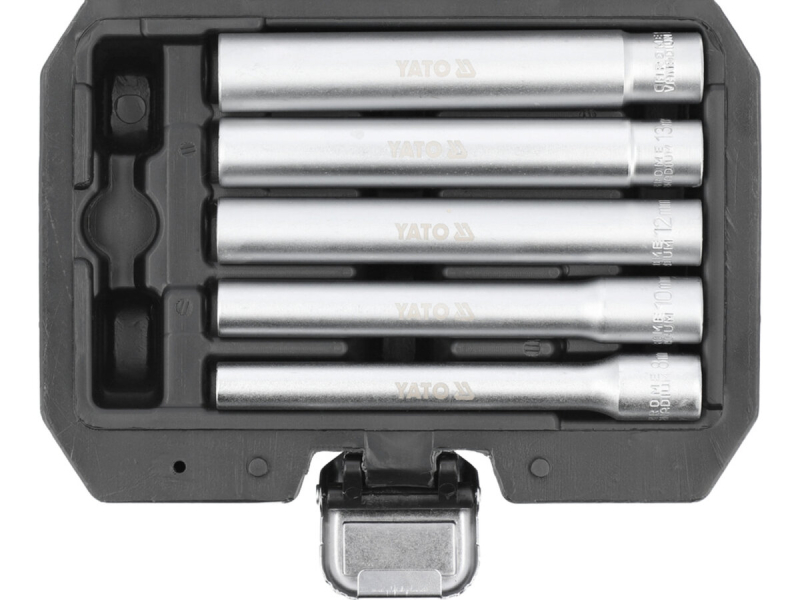 Професійний набір із п'яти подовжених головок популярних розмірів: 8, 10, 12, 13 та 14 мм. Призначені для відкручування глибоко встановлених болтів та гайок, таких як на бамперах, задніх ліхтарях, дверних петлях та панелях кузова.