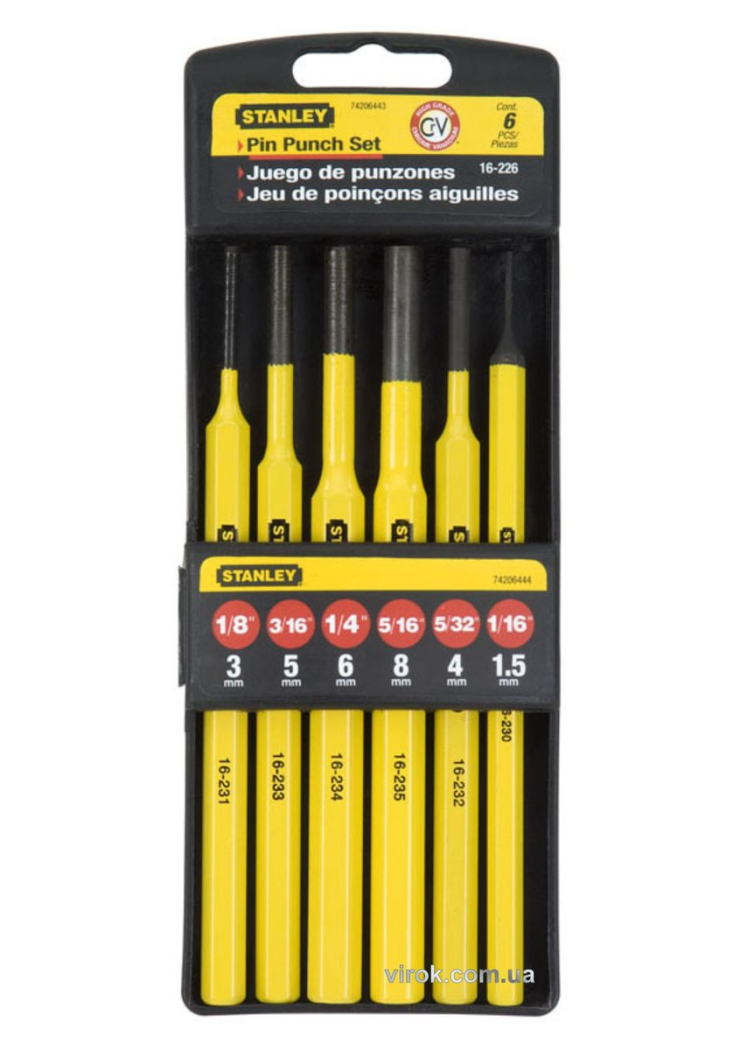 Набір пробійників слюсарних "STANLEY" : M=(1,5/3/4/5/6/7/8) мм. Компл. 6 Шт.