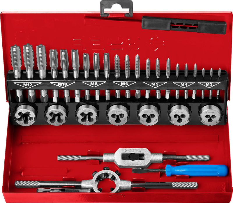 Набір мітчиків та плашок М3 - М12, плашко-мітчикоутримувач, 32 шт, в металевому боксі