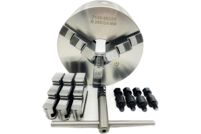 Данная модель серии 7100-0033П диаметром 200 мм рекомендована для применения на станков с конусом шпинделя С6: 1М63, 1А64, 16К25 и аналогов. Крепление через конус С6 позволяет использовать патрон на широком классе тяжёлых токарных станков. Фланцевое соединение через поворотную шайбу гарантирует соосность в пределах допуска ГОСТ.