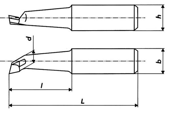 | Угол врезки пластины 10° | Угол врезки пластины 0° | Сечение резца h×b, мм | L, мм | l, мм | d, мм | Исполнение |