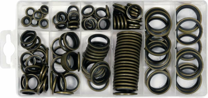 Набір 150 шайб сталево-гумових. включає шайби: 20 штук: M12 x 1,9 мм, M14 x 1,9 мм, M16 x 1,9 мм, M18 x 1,9 мм, M20 x 1,9 мм 10 штук: M6 x 1 мм, M8 x 1,9 мм, M10 x 1,9 мм, M22 x 1,9 мм, M24 x 1,9 мм матеріал: сталь і гума NBR 70