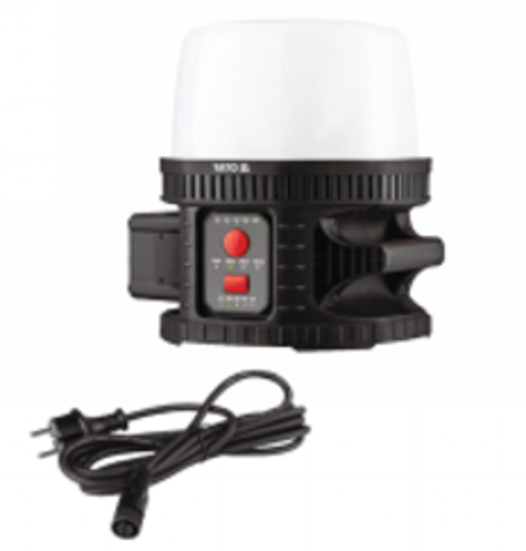 Надпотужний портативний світильник із плафоном 18 В, що випромінює світло без відблисків. Пристосований для використання на будівельних майданчиках, у майстернях, промислових підприємствах, під час оздоблювальних робіт за різних погодних умов. Забезпечує відмінну дифузію світла на 360°.