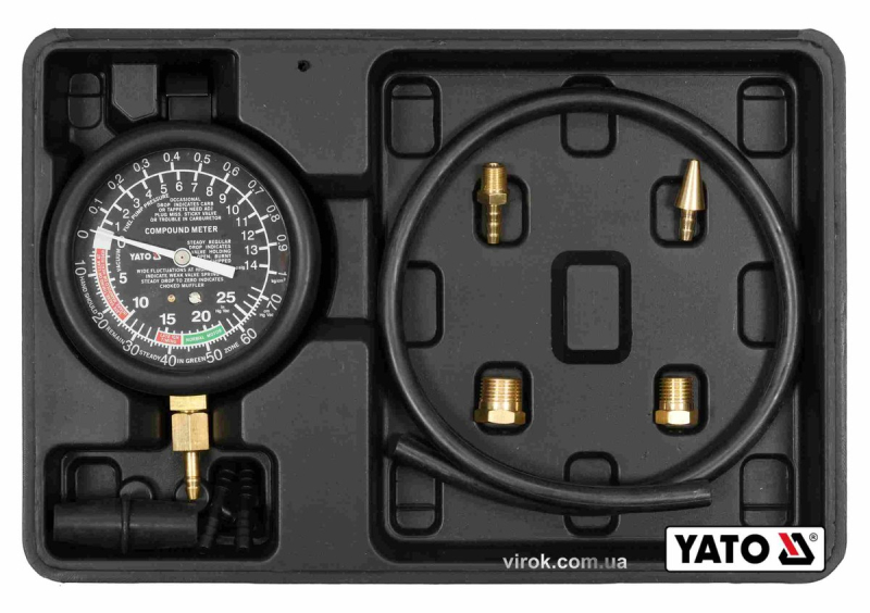 Тестер для вимірювання вакуума і компресії YATO: 0-0.1 МПа, зі спорядженням, 9 шт + кейс [10]