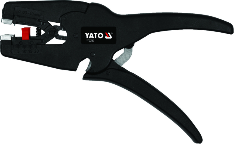 Знімач ізоляції автоматичний 195 мм 0,03-10 мм² YATO YT-22753 механізм для швидкої і автоматичної зачистки плоских і круглих кабелів від 0,5 мм2 до 10,0 мм2 кінці робочих губок з загартованої сталі SK5 можливість установки довжини ізоляції, що зачищається від проводу можливість обрізки кабелю